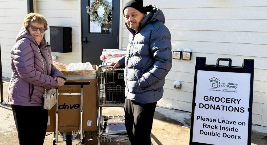 Churchill Place Memory Care residents brave the chilly weather to deliver a grocery cart full of food to Glen House Food Pantry in Glen Ellyn, Illinois for distribution to families over the holidays. Giving back is a huge part of the holidays, especially for residents who have enjoyed volunteering all their lives!