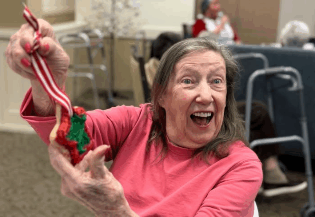 Our residents enjoy making their own decorative ornaments each year. This vivacious resident of Emerald Place Memory Care in Glenview, Illinois shows off her handiwork before hanging it on the tree.