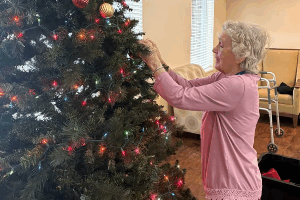 Tree trimming is a great way to get into the holiday spirit. Each year residents enjoy the camaraderie of getting out their favorite ornaments and sharing stories of holidays “back in the day”. Here, a resident of Porter Place Memory Care in Tinley Park, Illinois puts the final touches on their tree.